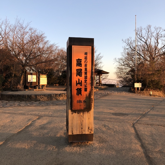 高尾山頂の標識も朝日に照らされております。